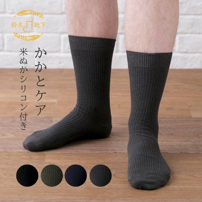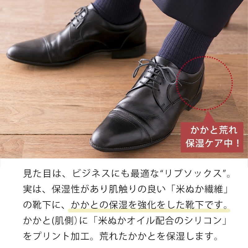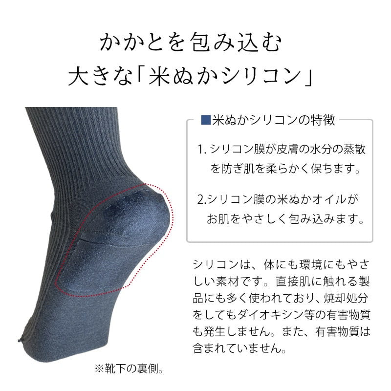履くだけで、手間なく簡単にかかとケアが出来る靴下です。繊維に米ぬかの保湿成分が練り込まれており、しっとり滑らかな肌触りです。特に荒れやすいかかとには、「米ぬかシリコン」をプリント加工。