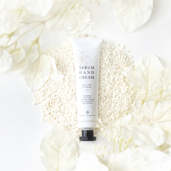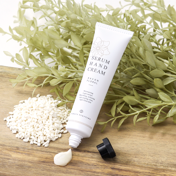 福山醸造蔵の「北海道産 米糀」から抽出したコメ発酵エキスをはじめ、ナイアシンアミド、アルブチン、ツボクサエキス、ククイナッツオイルなど手肌にうれしい成分を贅沢に配合したクリーム状ハンド美容液です。