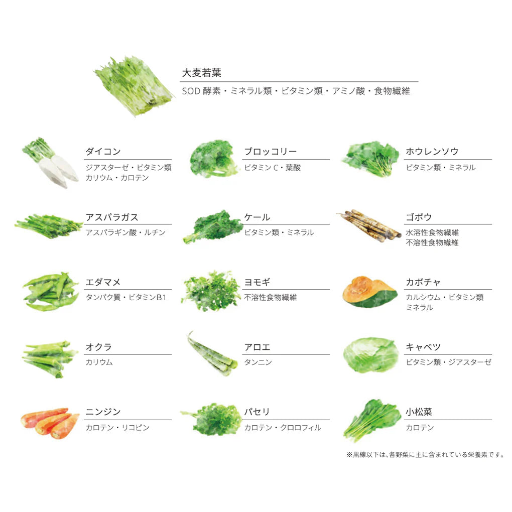 Barley leaf powder (domestically produced), resistant dextrin (soluble dietary fiber), reduced maltose, starch, spore-forming lactic acid bacteria powder, aloe vera powder, cabbage powder, burdock powder, radish powder, carrot powder, fermented grain extract (contains wheat), mixed vegetable powder (kale powder, broccoli powder, mugwort powder, asparagus powder, okra powder, komatsuna powder, pumpkin powder, radish leaf powder, parsley powder, spinach powder), bifidobacteria powder (contains dairy ingredients), edamame powder (contains soybeans), sterilized lactic acid bacteria powder, white peach blossom extract (contains peach)